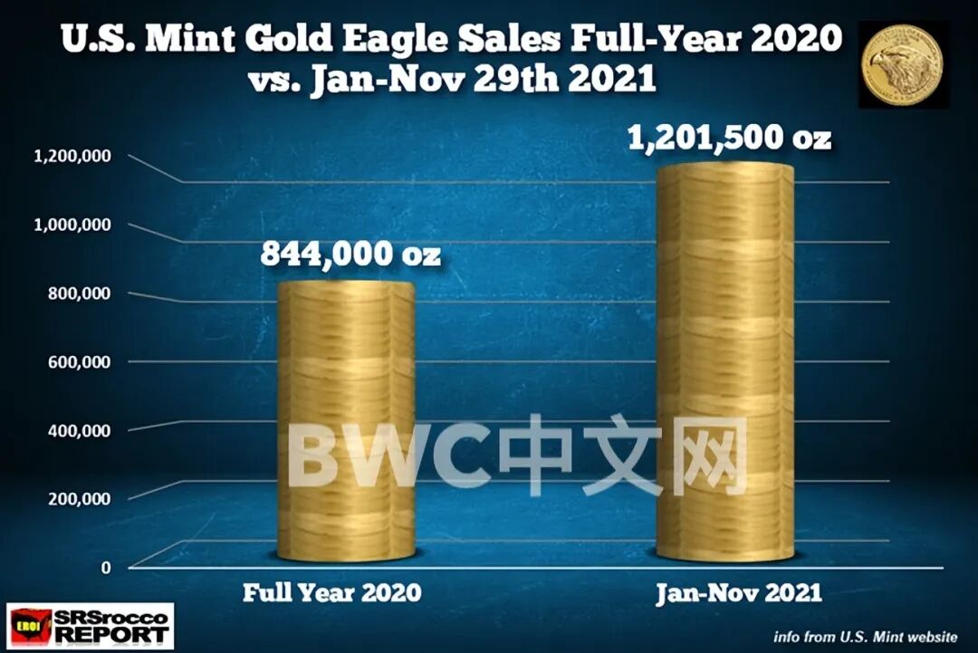 另据美国铸币局在4月28日最新公布的数据显示,2022年1月至4月15日,该机构的金币销售量为107.36万盎司,仅用了4个多月的时间就完成了2021全年销售量的90%,更远超过2020年的84.5万盎司。