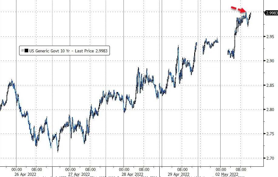 5月3日,除了美元指数、美股、原油和黄金等市场出现震荡外,美国国债市场也出现了紧张情绪,美债被市场大幅抛售,美债价格延续六周以来的跌势,十年基准美债收益率自2018年12月以来首次突破3%(3.0003%),与美元指数一起攀升,而自4月1日以来,该指标已经累计大幅上涨60.36个基点。