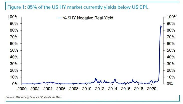 正如下面由德意志银行研究员Jim Reid在4月30日所提供的图表所示,目前,美国债券市场中85%的不同期限的美债收益率低于当前的通货膨胀率,实际收益率为负值,这也意味着从理论上来说,包括日本、中国、英国、沙特等海外美债持有者存在将要为持有美债而变相向美国付款的可能,这在以前是不可想象的,实际收益率为负值意味着投资者在购买美债时按月通胀计算会亏损。