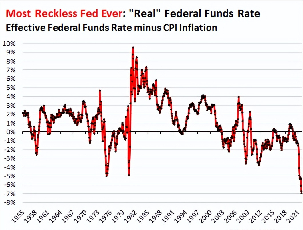 这也意味着指标10年期美国实际联邦基金利率经通胀值(8.5%)调整后变为负5.50%,正如下图所示,这个数值是自1952年以来跌幅最深的时候,正如,美银在5月1日发表的报告所指出的那样,随着高通胀将维持更久更深,这会使得美债的实际收益率跌入更大的负值区域。