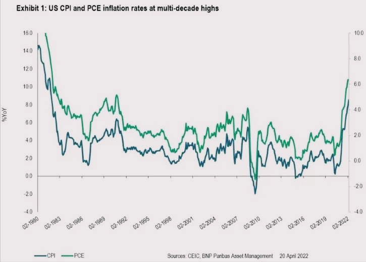 美国商务部在4月30日的数据显示,3月个人消费支出价格指数(PCE)数据大涨6.6%(前值为6.4%)至40年新高,是美联储设定目标的三倍多,同时,3月份PPI数据也同比上升11.2%,以上数据显示令人担忧的高通胀趋势仍将持续,没有见顶的迹象,因为PPI被认为是反映CPI通胀压力的先行指标。