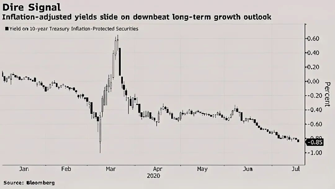 现在华尔街的热门人物耶伦也在参加花旗电话会时表示,美联储对不断恶化的金融和经济形势已经做出了积极的反应,零利率会保持很多年,负利率也不是不可能。另外,随着双赤字膨胀,除了负利率,美联储似乎再也拿不出更为宽松的政策和降低其利息支出的举措了。另外彭博巴克莱的数据显示,美国通货膨胀保值债券自2020年第四季度以来已经迄今上涨了0.8%,以上这些数据和消息也意味着,一旦时机合适,美国将进入负利率时代,就意味着美债收益率直接跌破零,且将维持很长一段时间,因为,现在美国的真实收益率已经一直在持续下降之中。