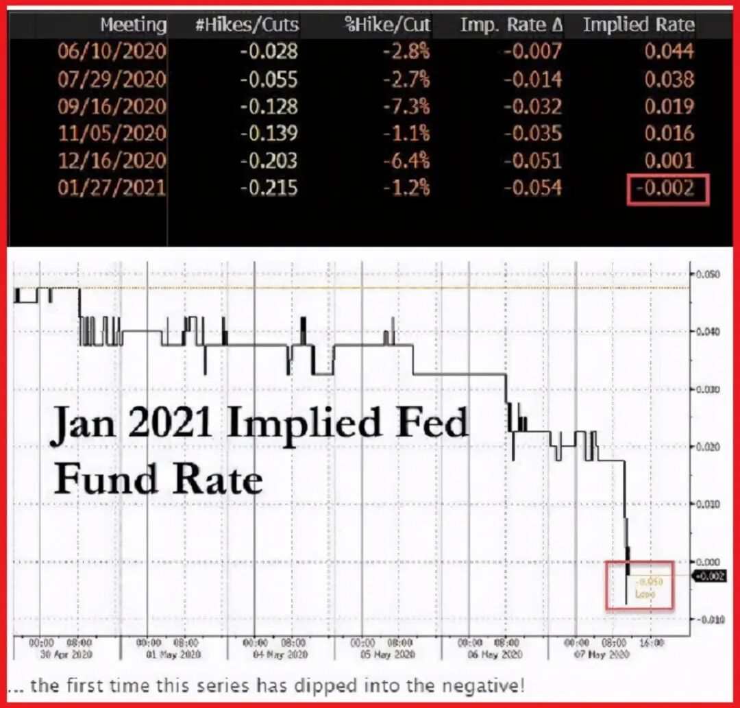 全球资产管理公司Guggenheim接受彭博采访时称,即使美联储不实施负利率,但市场也可能接过任务并推动利率破零,因为,二周前,联邦基金期货的市场数据已经表示从5月开始,利率可能会跌至略低于零,正如下图数据模型显示,美国进入负利时代信号显示,市场开始押注交易。