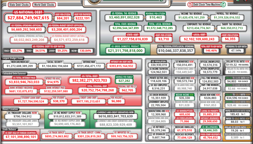 这也意味着美国正在将这数十万亿美元的债务进行货币化,如您所见,美国M2在2020年增长了60%以上,截止2月8日,在下面这个像飞机仪表盘样的美国联邦国债实时钟上显示的债务赤字总额已连跳三级接近28万亿美元大关,且数据还在实时增长中,这也意味着美国支付的债务利息正在快速上升,而自2009年以来至二季度,美联储已经将其资产负债表扩大了622%,但在此期间,美国经济GDP的累计总增长仅为33.12%。