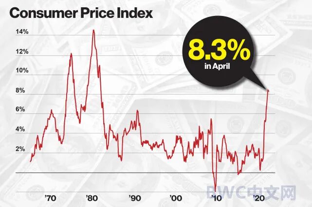 如下图所示,美国劳工统计局于5月11日最新发布的美国4月消费者价格指数CPI同比上涨8.3%,高于市场预期的8.1%。尽管较3月的8.5%有轻微回落,但依然在近40年罕见的高位置徘徊。