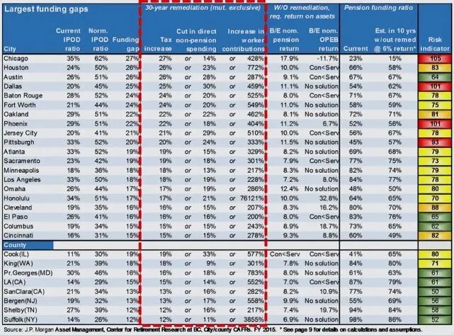 在摩根大通发布的美各州市县的风险等级排行榜图片数据也表明有十几个城市的年度预算中,超过50%用于为过去支出的维护成本提供资金,或许最终会走到破产的边缘。