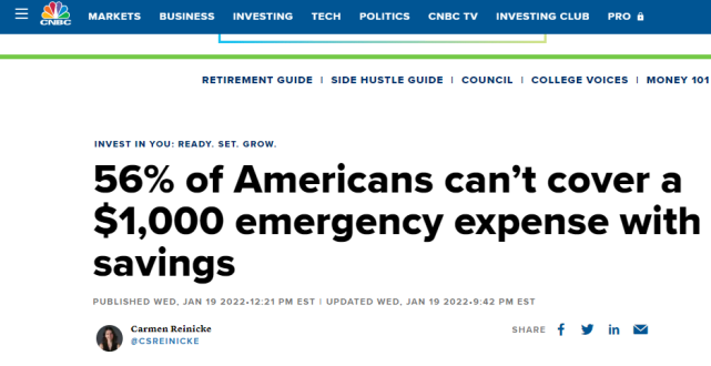 而据美媒CNBC援引Bankrate 在 1 月初对 1,000 多名成年人进行的电话调查,约56%的美国人无法用储蓄支付一旦发生意外的1,000 美元账单。也就是说,56%的美国人拿不出1,000 美元。Bankrate 高级副总裁兼首席财务分析师格雷格麦克布莱德说:“紧急储蓄和 1,000 美元的门槛确实表明美国人有多少挣扎,他们在财务上如此接近边缘。”这些迹象都表明,越来越多的美国人已经并且即将为欠债上瘾的美国经济而付出昂贵代价。