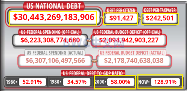 截至5月12日,美国联邦债务总额激增至30.44万亿美元,是世界历史上任何国家的最高水平。如下图,每个美国公民(男人,女人和孩子)为此背负的债务为 91,472美元,是有史以来的最高水平。每个美国纳税人的债务也创下了242,501美元的历史新高。美国联邦债务总额与GDP的比率现在达到创纪录的129%,这一比例比2000年增加了70.91%。