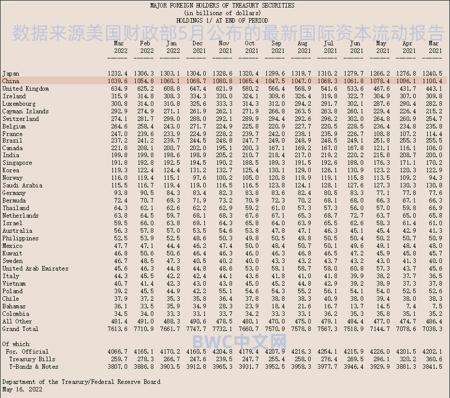 根据美国财政部5月17日公布的报告显示,美债官方持仓数据会有两个月的延迟惯例,3月份,包括全球央行在内的官方机构大幅抛售了324亿美元的美债,是2月抛售量的2倍多,且为两年以来的最大月度抛售规模。