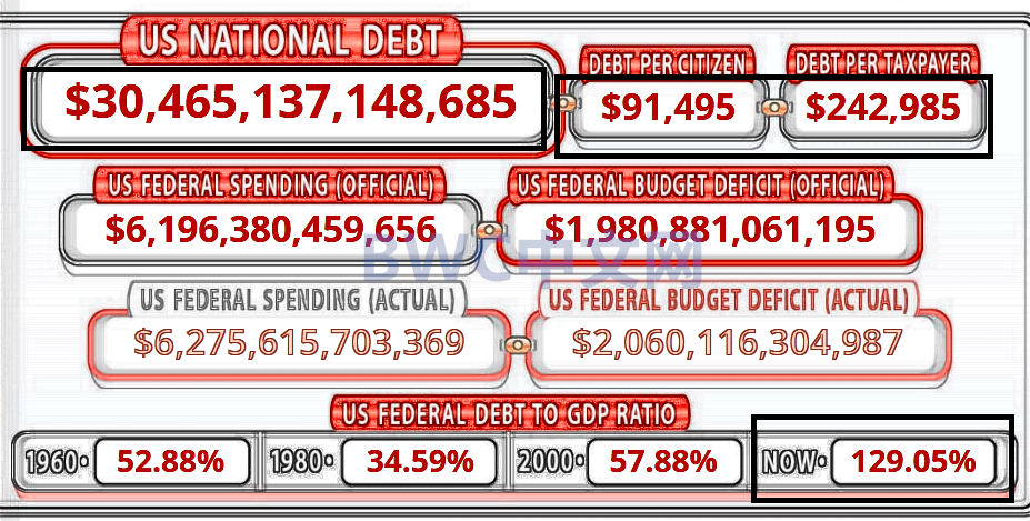 截至5月22日,美国联邦债务总额激增至30.47万亿美元,达到美国GDP的约129%。这一比例比2000年增加了70.91%。美国是全球最大的债务国。如下图,在每分每钞都在增长的美国债务时钟上,平均每个美国人(老幼皆计算在内)背负的债务为91,495美元,每个美国纳税人为此背负242,985美元。这说明,美国经济过去半个多世纪以来的繁荣都是建立在巨额债务基础之上的。