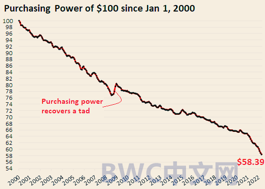 这也是债务货币化背景下,美国人习惯于提前消费,不思进取的后果之一,进而美元购买力不断被吞噬。如下图,2000年1月100美元的购买力已经下降到目前的58.39美元。