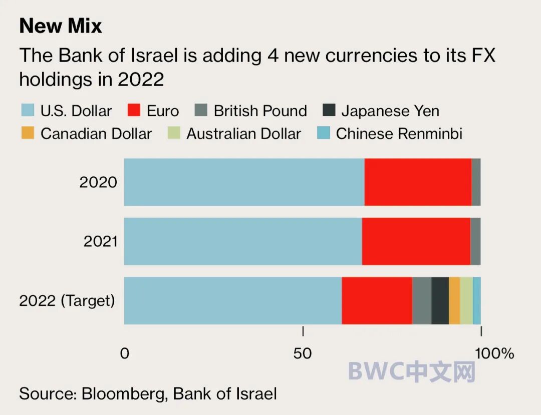 与此同时,一些国家也开启了去美元化进程。比如,以色列上月宣布将美元的外汇储备份额从66.5%下降到61%,抛售了比例为5.5%的美元储备。同时,首次增加人民币储备,将人民币的比例定为2%。外媒称,未来以色列存在抛售规模高达其外汇储备20%甚至更多的美元份额。以色列正在减少美元的风险敞口。