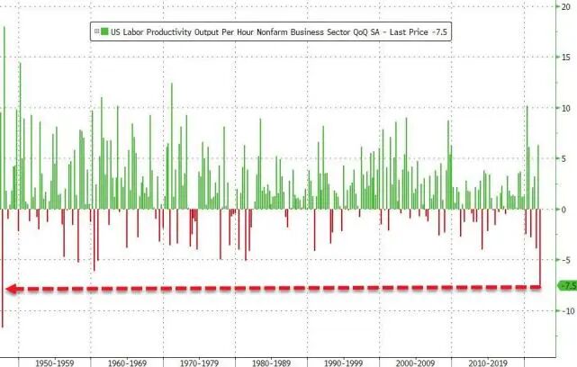 因为,美国经济主要是靠债务增长来驱动的,但凯恩斯主义经济学并不是万能药,这也决定了美元以锚定美债扩张规模发行后其回报会被不断稀释,因为包括工业金属、能源等要素受供应链瓶颈影响,使得生产率低迷会导致财政收入下降,这就意味着,在美元外升内贬的过程中,美国将要面临长期的因生产率低迷而制约经济活力的事实,而美国今年第一季度生产率年化环比大降至负7.5%,且为1947年第三季度以来最大降幅就是最新的例证。