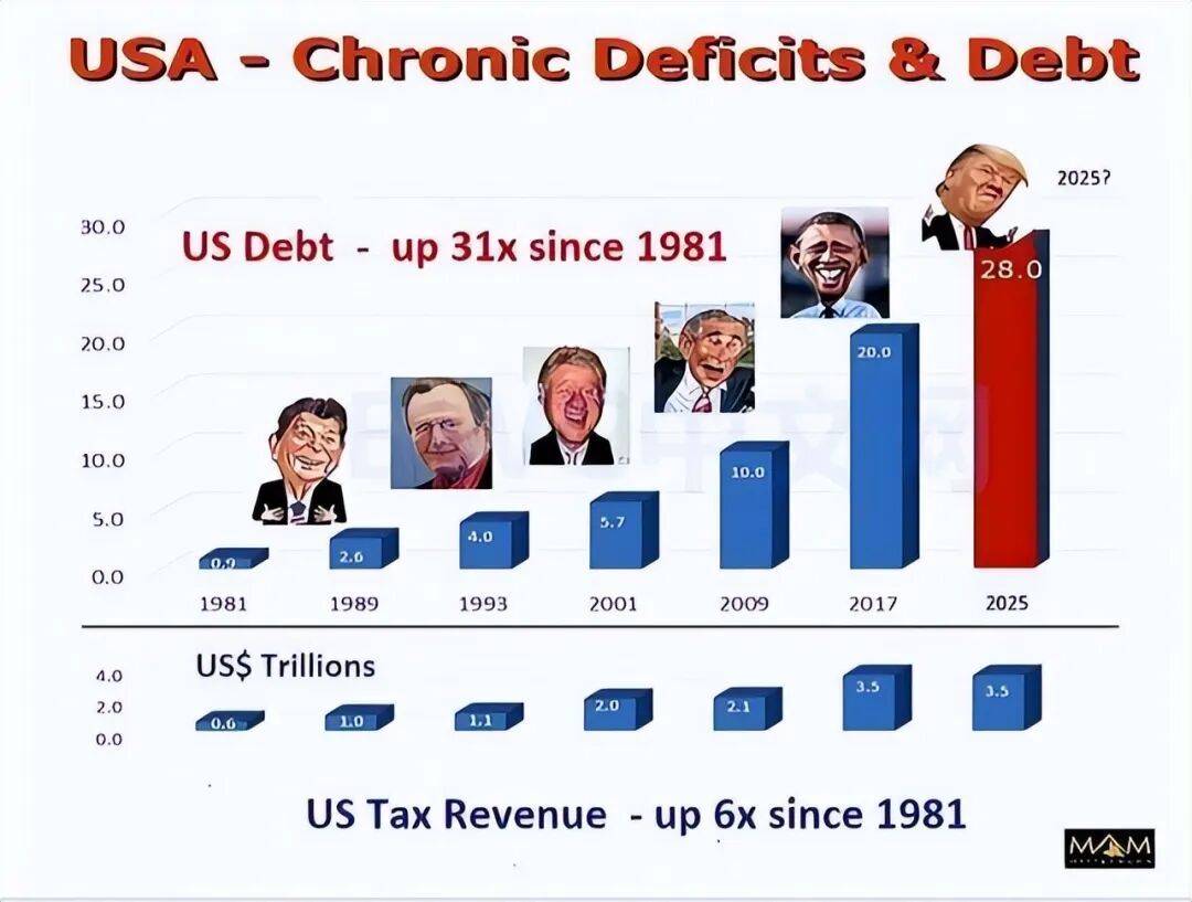 值得注意的是,平均每8年,美国债务水平就要翻一番。照此趋势,在2030年时,美国债务可能就要达到约60万亿美元。这一数字或将超过美国GDP的近250%。