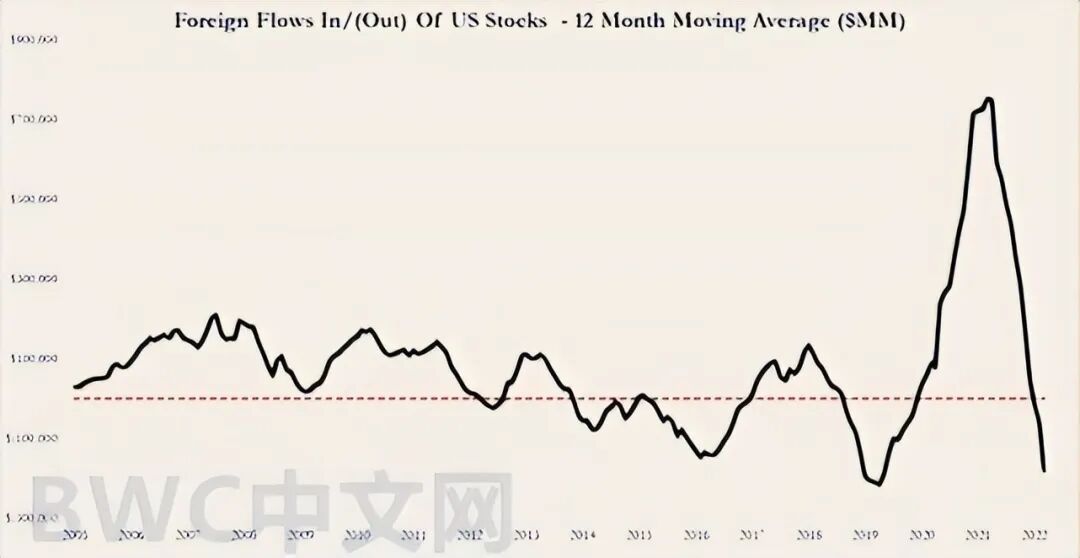 而根据美国财政部5月16日公布的最新一期TIC数据显示,数据延后两个月惯例,外国买家在在3月份卖出了 943.38 亿美元的美国股票,这是至少是自1978 年美国财政部开始跟踪这一数据以来的最大流出量。而从12个月长期滚动水平看,外国买家截至3月的12个月抛售美股移动均值为1800亿美元,仅略低于2018年末美联储被迫扭转货币紧缩时所创的最高纪录。