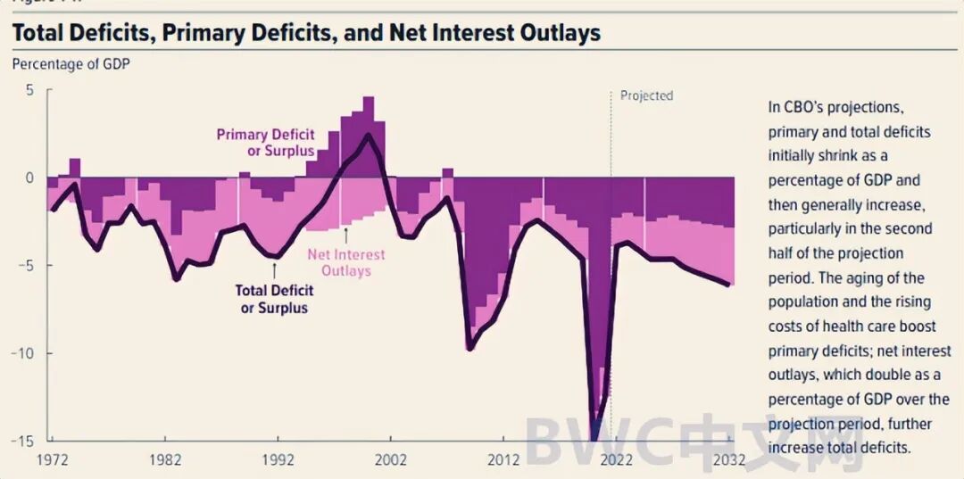 在2025年之后,政府赤字率将一直保持在4.5%以上,这也是美国自1930年以来,第一次在如此长期的时间中(五年及以上),保持这样大规模的赤字水平。白宫前首席经济顾问Larry Kudlow表示,美国未来十年将新增数万亿美元赤字。之后由于更大规模的利息成本和大型福利项目,如更多的美国老龄人口造成退休福利负担增加和更多的医疗负担及超支将重新扩大,并造成赤字的稳步上升。
