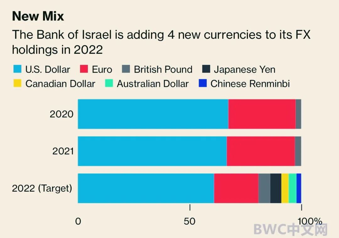 这些增加标志着以色列银行“整体投资指导方针和理念”的变化,以色列央行副行长安德鲁·阿比尔在接受采访时说。根据以央行报告,在新方法下,2022年人民币的比重定为2%。为了适应这些变化,欧元的份额将从刚刚超过30%下降到20%。这是至少十年来的最低水平。而美元的份额将从 66.5% 下降到 61%。