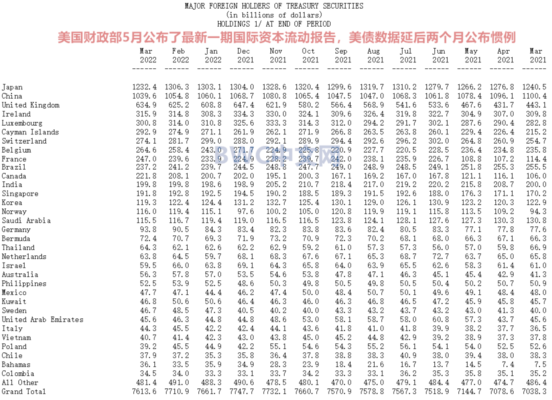而据美国财政部5月16日公布的最新一期国际资本流动报告TIC显示,该数据会有两个月的滞后期,全球买家在3月总计抛售高达973亿美元的美国国债,价值约合6480亿人民币的美国国债。