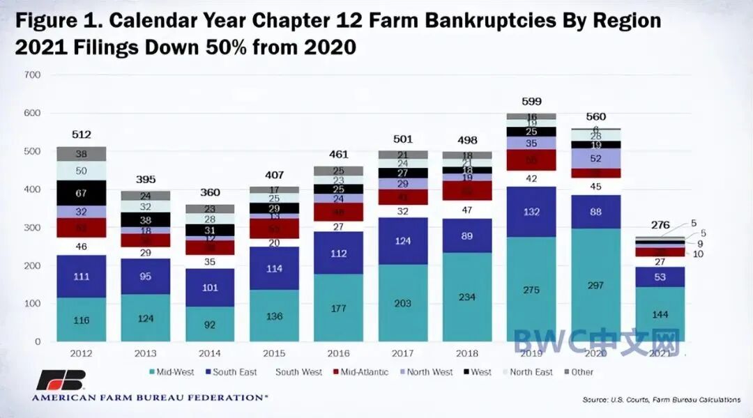 根据美国农业联合会最新报告,2021年依然有276家美国农场宣布破产倒闭。而自2018年以来的四年间,高达1933家美国农场破产倒闭,而过去十年间累计4569家美国农场破产倒闭。虽然数量并不太大,但正如本文前面提及,美国农场主经济高度发达,一个农场几乎关系到从生产,加工,出口等多个产业链,这就使得相关就业人口收入锐减。