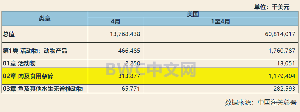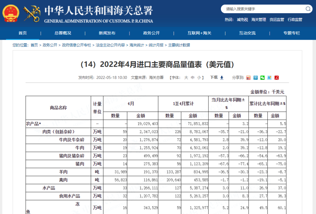 而按金额计算,4月进口肉类(包括杂碎)价值为2.347亿美元,金额比去年同期减少21%。1-4月进口肉类(包括杂碎)价值为8.782亿美元,金额比去年同期减少22.7%。值得一提的是,我们进一步查询海关总署公布的另一组数据显示,从美国进口肉及食用杂碎按金额计算,4月价值为3138.77万美元,1至4月价值为1.179亿美元。可以看出,在市场进口整个减少的情况下,虽然美国拥有大规模的农场,但是美国的肉类及杂碎商品占有的整体市场份额并不高。