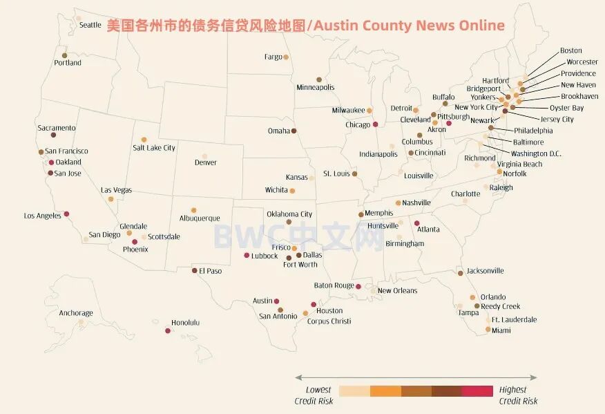下面由摩根大通最新发布的美各州市县的风险等级排行榜图片数据也表明有十几个城市的年度预算中,超过50%用于为过去支出的维护成本提供资金,或许也将被这颗债务金融“核弹”摧毁,因为现在的债务成本正随着利率不断上升。