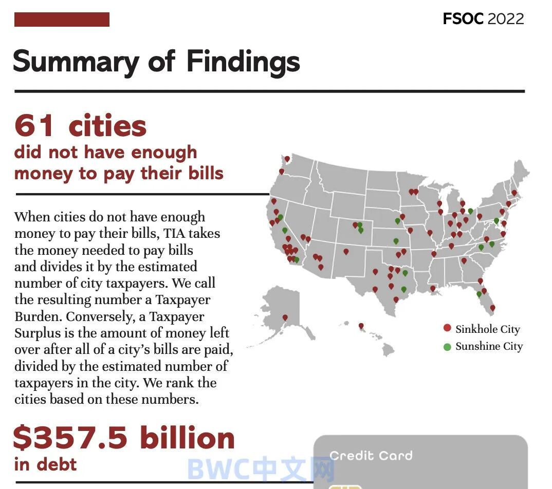 据美国《会计真相》网站发布的美国2021年度城市财务状况调查报告表明,在该机构调查的在美国人口最多的75个城市中,有61个城市在新冠病毒蔓延期间所积累的财政状况问题严重,没有足够的钱来支付所有的账单。尽管美国联邦已经进行了援助,但大多数城市的财务状况都在恶化。截至2021财年末,美国75个最大城市的总债务达到3570亿美元。