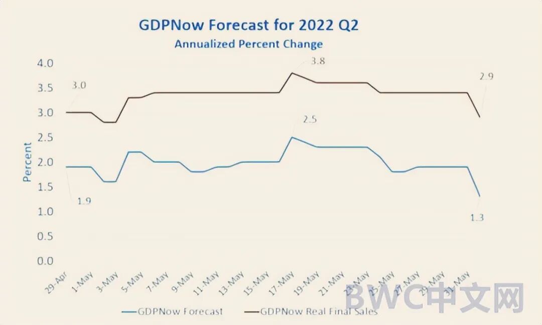 亚特兰大联储6月对美国2022年第二季度实际 GDP 增长(经季节性调整的年率)的最新预估为1.3%,低于5月27日的1.9%。