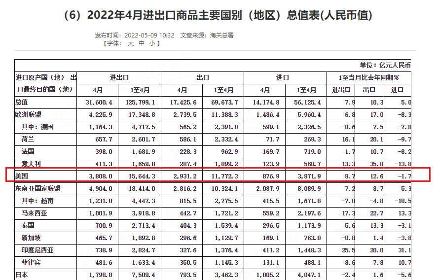例如,根据中国海关总署5月9日公布的数据显示,今年前四个月,中国对美国出口1.18万亿元,增长12.6%;自美国进口3871.9亿元,下降1.7%;对美贸易顺差7900.5亿元,增加21.2%。这就意味着,前四个月,至少价值1.18万亿元的中国货运往美国,而只有3,871.9亿元的美国商品运往中国。美国收到价值1.18万亿的中国货。