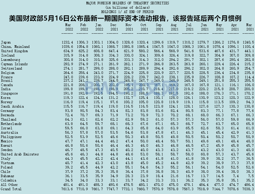 而据美国财政部5月16日公布的最新一期国际资本流动报告TIC显示,该数据会有两个月的滞后期),全球买家在3月总计抛售高达973亿美元的美国国债,价值约合6473亿人民币的美国国债。