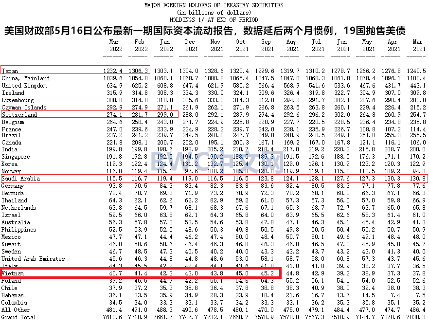 相对于日本,沙特,以色列,瑞士这四个国家大幅抛售美债,还有一个国家抛售美债也特别醒目,并且同样让市场意外。TIC最新数据显示,越南3月抛售了7亿美元的美债,而自去年10月至今年3月间,越南连续6个月都在抛售美国国债,累计抛售了规模为45亿美元的美国国债,从去年9月的452亿美元已减降至目前的407亿美元,累计抛售规模高达10%。