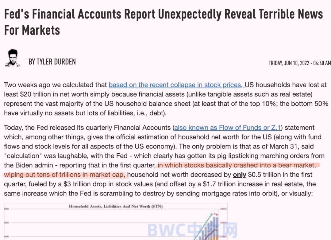 据美联储6月9日公布的金融账户数据显示,今年第一季度,美国股票持仓价值减少近3万亿美元,然而,这可能还只是个开端,据美国金融网站ZeroHege根据最近几周美国金融市场开始暴跌以来计算,美国投资者至少损失了20万亿美元的净资产,美国金融市场中更是有数十万亿美元灰飞烟灭。