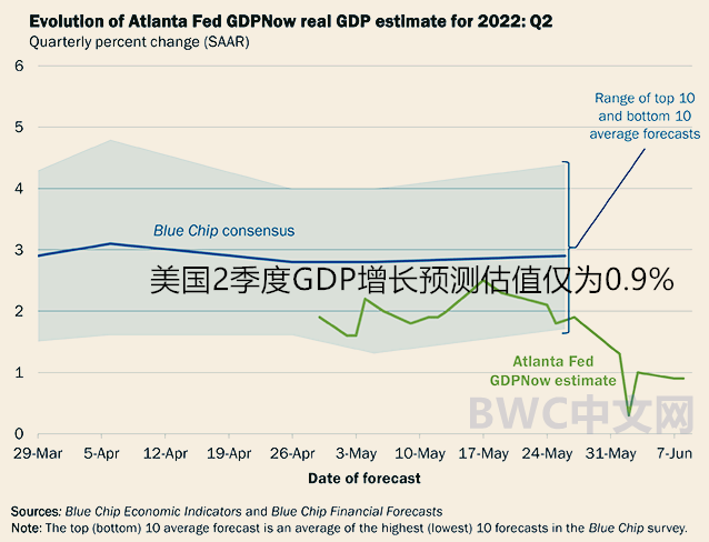 而有着“新债王”之称的冈德拉克表示,实际上,早在2018年时美国的债务规模就已经超过了名义GDP,如果不是债务增长,美国的经济将是负增长。而根据亚特兰大联储6月8日最新预测模型显示,2022年第二季度美国实际 GDP 增长(经季节性调整的年增长率)的估值为0.9%。而根据美国人口普查局发布的最新批发贸易数据,在美国,库存投资对第二季度实际 GDP 增长的贡献率的预测值从-1.61 个百分点降至-1.62 个百分点。
