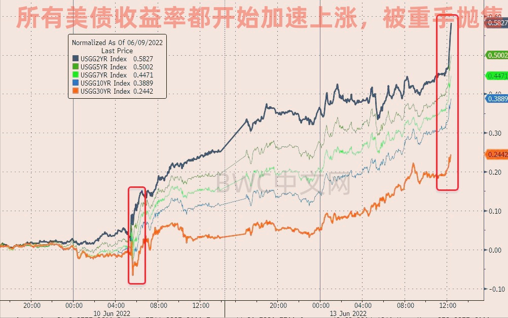 数据显示,美债收益率大幅度涨至10年来的最高水平,美债处于四十年来最猛烈的抛售潮之一,短期收益率累计上涨超过60个基点,为1987年以来最大涨幅,指标10年期美债收益率达到3.475%,为2011年4月以来最高,另外,让市场担心的2年期和10年期收益率曲线更是出现倒置,利差为负5个基点。这里要说明一下,债券收益率上涨代表债券的抛售量大于购买量,其与价格成反比,收益率上升代表美债不受市场欢迎。