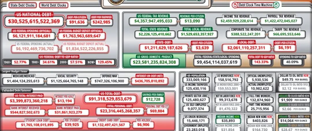 在美国纽约西43街竖立着一块美国国债实时钟表,实时更新着美国联邦债务总额数据,6月19日,上面显示的债务总额已经超过30.5万亿美元大关,占GDP之比持续攀升至129.45%,并且美国的债务数字还在飞速增长中,如果你在那停留一个小时,那么又会增加9000万美元。