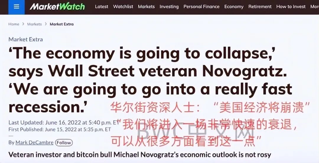 资深华尔街投资人迈克尔·诺沃格拉茨(Michael Novogratz)在6月17日对美媒MarketWatch表示,“美国经济将开始崩溃,进入一场非常快速的衰退,可以从很多方面看到这一点”。