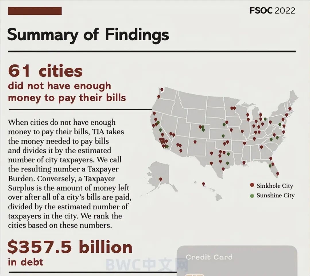 据美国会计行业机构Accountingtruth在6月最新公布对美国人口最多的75个城市的2021年度城市财务状况调查报告表明,有61个城市在新冠病毒蔓延期间所积累的财政和债务问题非常严重,没有足够的钱来支付所有的账单,截至2021财年末,美国75个最大城市的总债务达到3570亿美元。