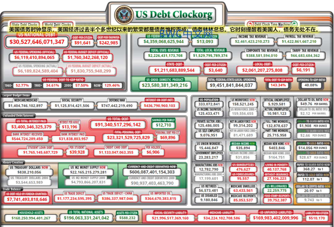 截至6月21日,美国联邦债总额已高达30.53万亿美元,达到历史最高水平,约占美国GDP的129.46%。这表明,美国经济实际上是入不敷出的,如下图,这个每秒钟都在变化增加的美国债务时钟显示,美国经济过去半个多世纪以来的繁荣都是债务堆积而成,债务林林总总。它时刻提醒着美国人,债务无处不在。