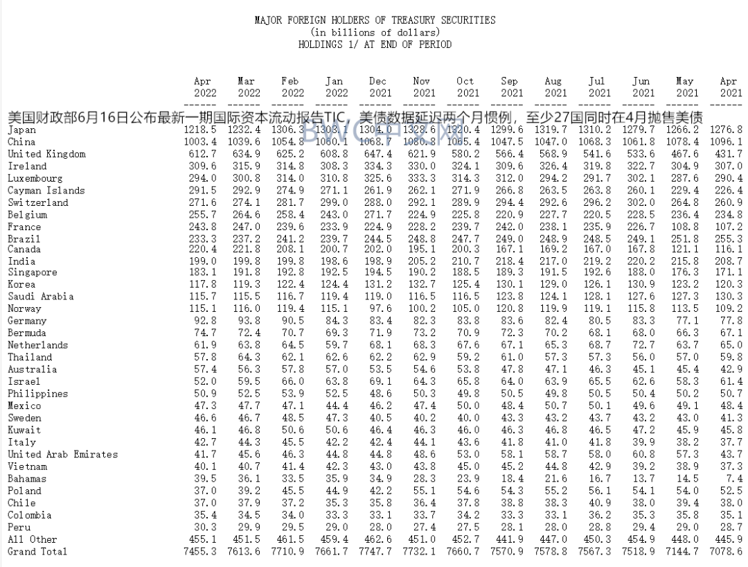 而事情的另一面,根据美国财政部6月16日公布的最新一期国际资本流动报告TIC最新数据,报告数据延后两个月统计惯例,外国官方机构在今年4月外国买家就总计抛售高达1583亿美元的美国国债。至少27国在4月同时抛售了美债。