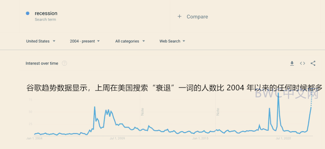 谷歌趋势数据显示,上周在美国搜索“衰退”一词的人数比 2004 年以来的任何时候都多。