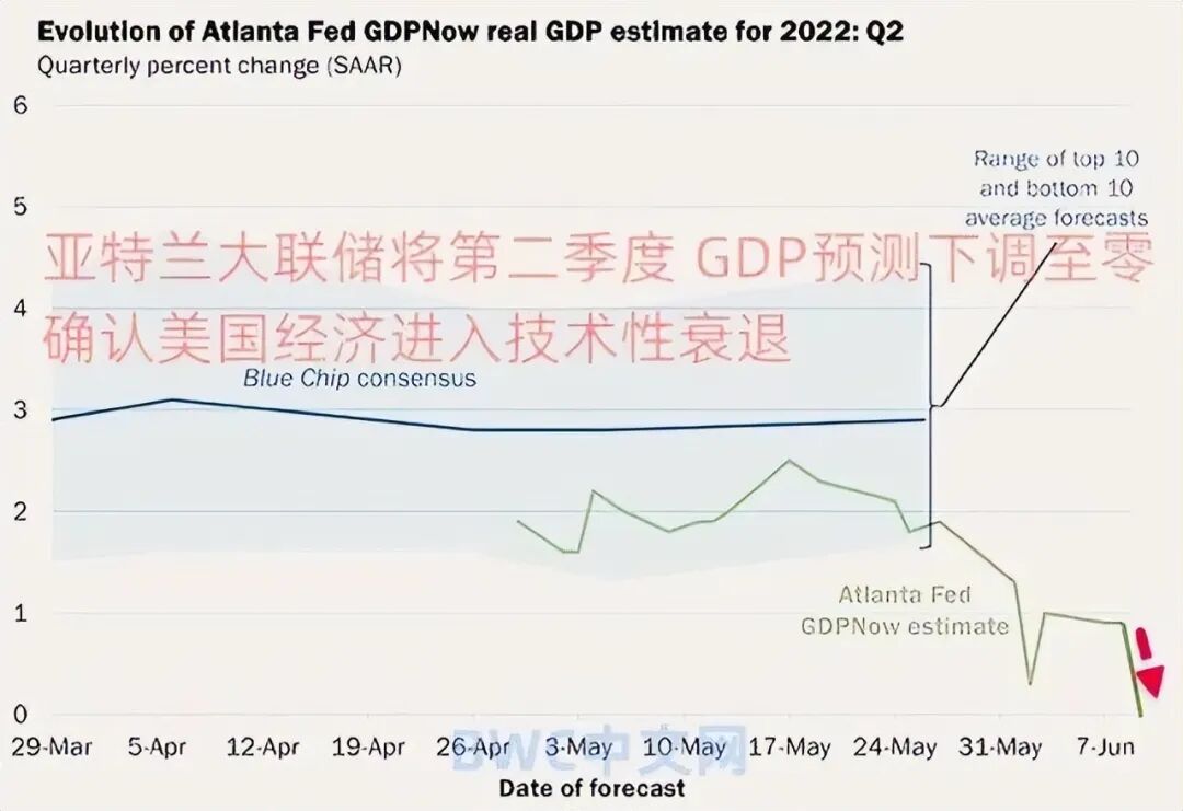 紧接着,亚特兰大联储的GDPNow追踪器已经将美国第二季度的经济增长率从1.3%下调至0%,且是近二周内第三次下调,而今年第一季度,美国GDP增长率已经为负1.5,经济衰退被定义为连续两个季度的GDP出现负增长。