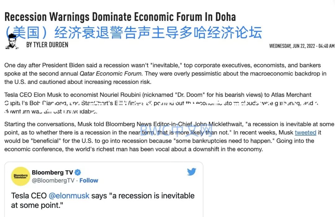 6月22日,美国经济衰退担忧加剧,美股期货走低跌超1%,国际原油期货跌超4%,稍早前,据彭博社6月22日报道,在卡塔尔多哈经济论坛上,马斯克,鲁比尼、高盛也均齐声警告美国经济衰退风险升高,桥水称降通胀行动将付出巨大代价。当然,仍有少数乐观主义者在寻找一线希望。