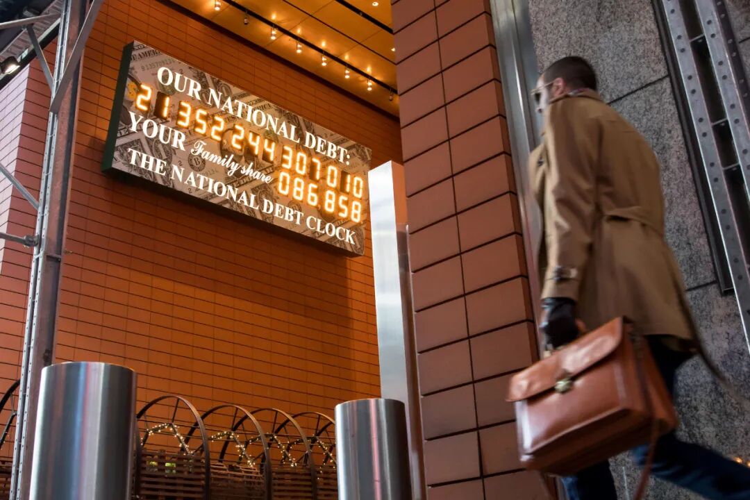 在美国纽约西43街竖立着一块美国国债实时钟表,实时更新着美国联邦债务总额数据,6月25日,上面显示的债务总额已经超过30.6万亿大关,占GDP之比持续攀升至129.78%,并且数字还在飞速增长中,如果你在那停留30分钟,那么又会增加4000万美元。