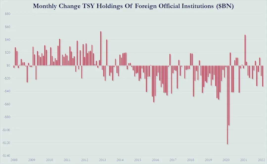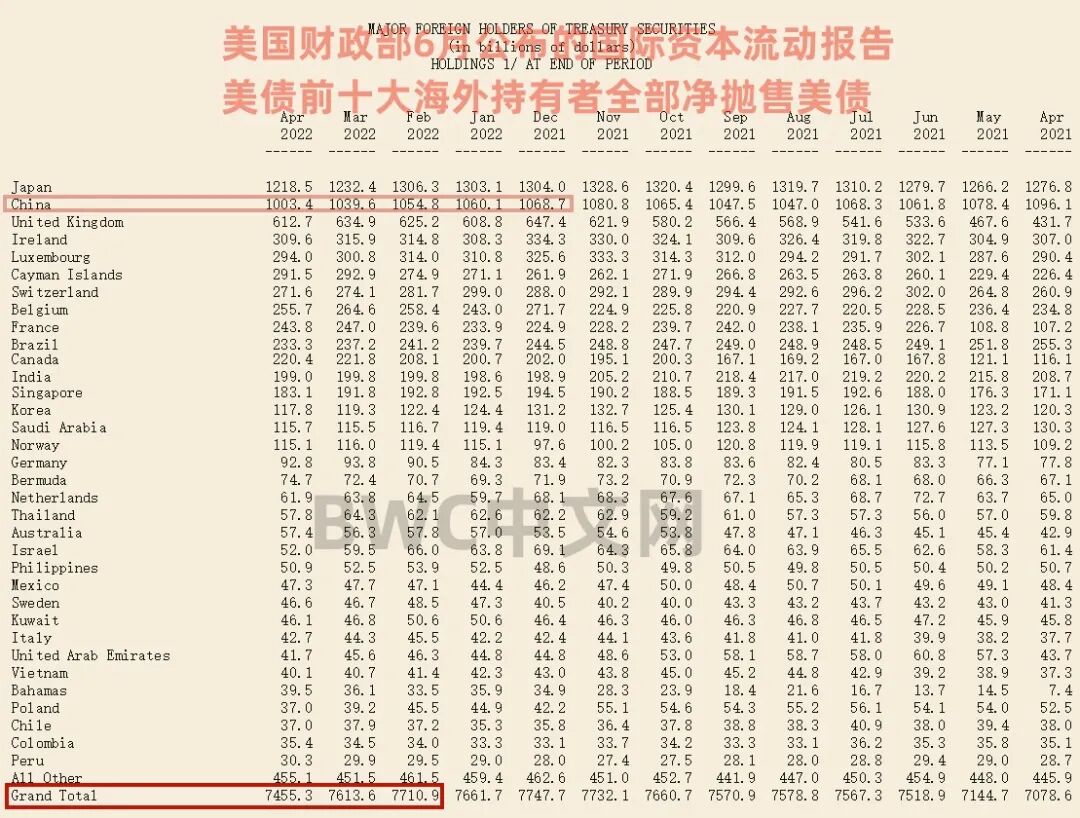 其中,从2021年12月开始,中国更是连续五个月共减持了775亿美元的美债,在4月更是大幅减持了362亿美债,为所有海外美债持有者中的抛售力度最大,仓位降至2010年以来的最低至1万亿,数据显示,从2021年1月至2022年4月的16个月中,中国有11个月在减持美债,按月度减持额计算,共抛售了1311亿美元美债,另外,自2021年1月以来,美债海外最大持有者的日本也持续抛售了高达1456亿美元的美债。