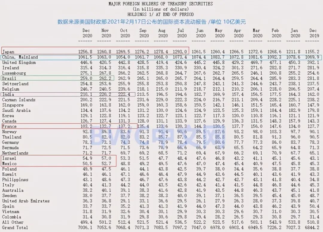 以美国国债为例,事情的一个新进展是,美国财政部2月17日公布的国际资本流动报告TIC(美债数据有两个月的延迟惯例)最新数据显示,外国投资者于2020年12月恢复净卖出美国国债。当月净卖出207亿美元的美债,并且外国投资者的美债持仓连续第五个月下降。在2020年12月,至少12个美债的海外央行持有者不同程度地减持了美债。而自2018年以来,全球央行就掀起了美债减持潮,已连续累积减持高达1.2万亿美元规模的美国国债。