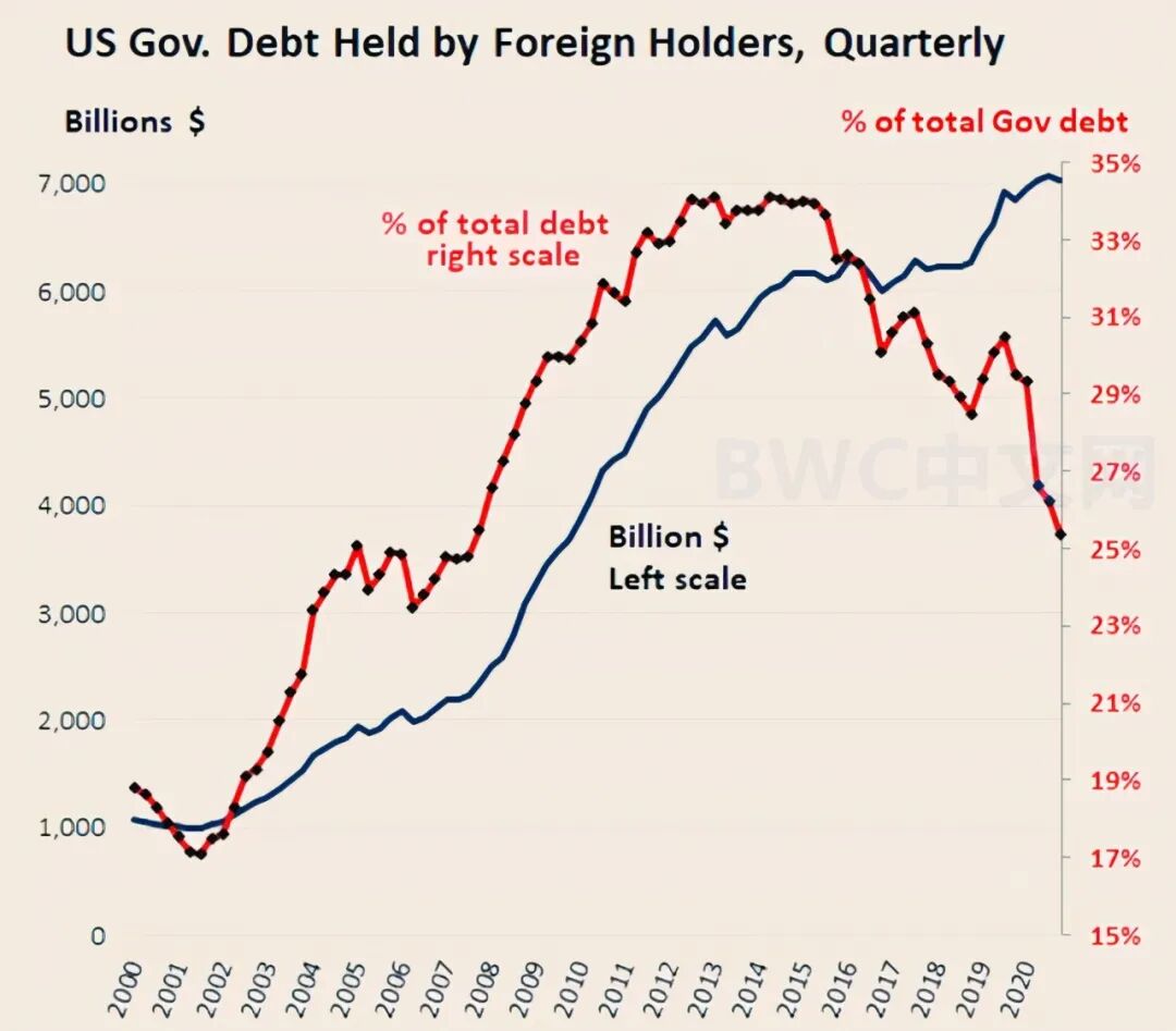 然而,据美国财政部2月17日公布的国际资本流动报告TIC(美债数据有两个月的延迟惯例)最新数据显示,2020年第四季度,外国央行,机构和投资者在令人难以置信的美国国债中所占的份额下降到25.4%,是2007年以来的最低水平。也就是说,25%的美债被全球投资者累计减持。而自2018年以来,超万亿美元规模的美债被全球央行,机构累计减持。