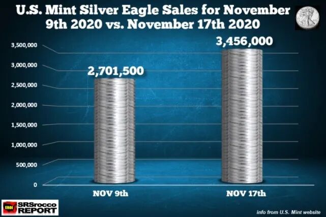 数据显示,目前,美国金币和银币的销售继续非常强劲,2020年11月到目前为止,银鹰的总销售量为346万枚,而去年整个月的总销售量为46.3万,此外,美国造币厂的金鹰币全年总销量为76.9万盎司,而2019年全年为15.2万盎司。