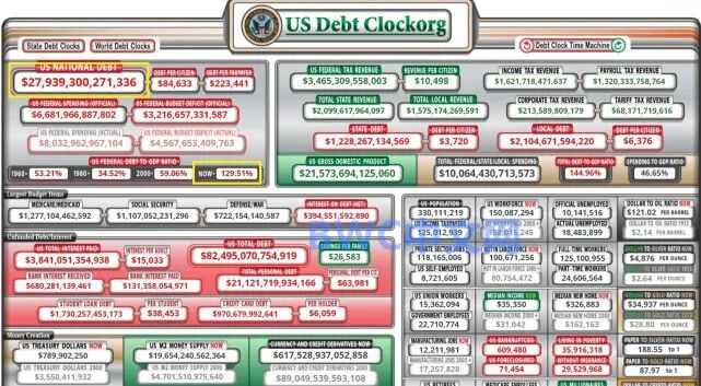 2月22日,在下面这个像飞机仪盘表一样的美国国债实时钟上显示的债务和赤字总额已经达28万亿美元,另根据美联储在1月最新编制的报告显示,美国金融体系的债务已经达到76万亿美元,除了公债外,较高的债务还包括公司借款,消费贷款以及州和地方政府增加的债务,简单的计算表明,美国人平均欠债约25万美元,甚至美国财政部暗示将考虑发行50年期或100年期的美国国债券。