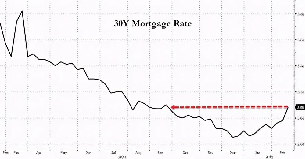 这也使得,美国机构房地美公司30年期抵押贷款利率升至2020年8月以来最高,截至2月25日当周,30年期住宅抵押贷款利率上升16个基点,至2.97%,为2020年8月20日以来最高,去年同期为3.49%,15年期利率上升13个基点至2.34%,去年同期为2.99%。
