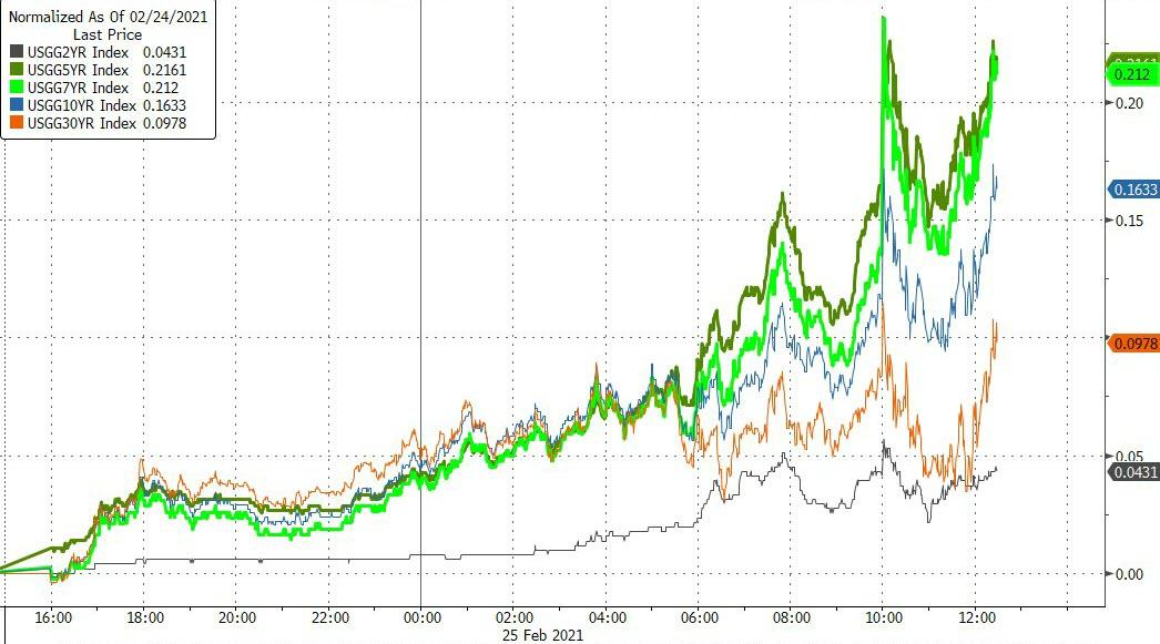 美债更是遭遇1月以来的猛烈抛售潮,2月25日和26日,最新的二次总额达1230亿美元的7年期和5年期美债拍卖上已经出现认购滞销趋势,投标倍数为过去十年来倒数第二低,甚至,这种抛售蔓延至短期债券,这意味着货币紧缩步伐快于预期,尤其是5年期美债收益率达到0.75%将成为国际金融状况收紧的临界点。
