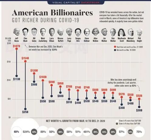 不仅于此,根据榜单显示,美国的亿万富翁平均增加了57%的财富 。有趣的是,这比标准普尔500指数同期的整体增长率高出约 10个百分点 。这就印证了,我们多次提及的,膨胀美元的最终受益者似乎只是那些离华尔街印钞机最近的一少部分精英。
